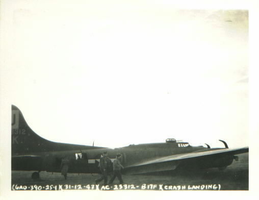 There is a photo of aircraft number 23312 crash landed in an English field on New Year’s Eve 1943 due to battle damage. The log reads 6:35 minutes. The target: German held airfields in Paris. Prop tips bent back, the aircraft rests on its undercarriage and crushed ball turret, visible anti-aircraft artillery damage to its tail, waist guns pointed toward the sky.